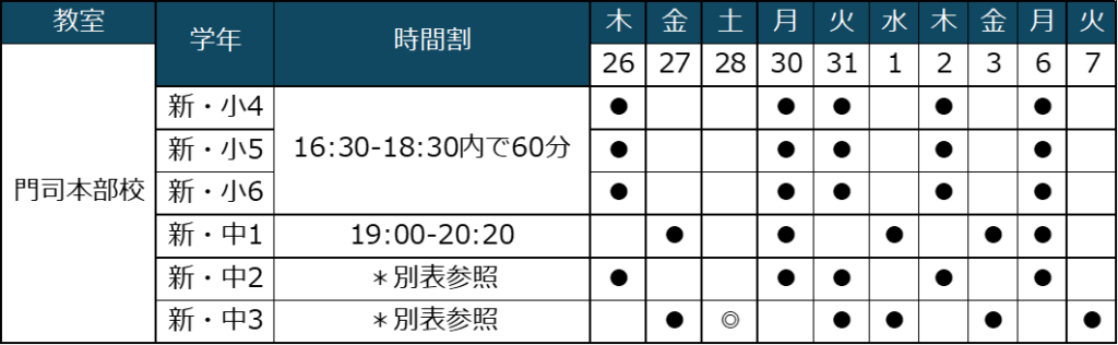 3/26(木)19:00-21:50、3/30(月)20:30-21:50、3/31(火)19:00-20:20、4/2(木)19:00-21:50、4/6(月)20:30-21:50【新中3】